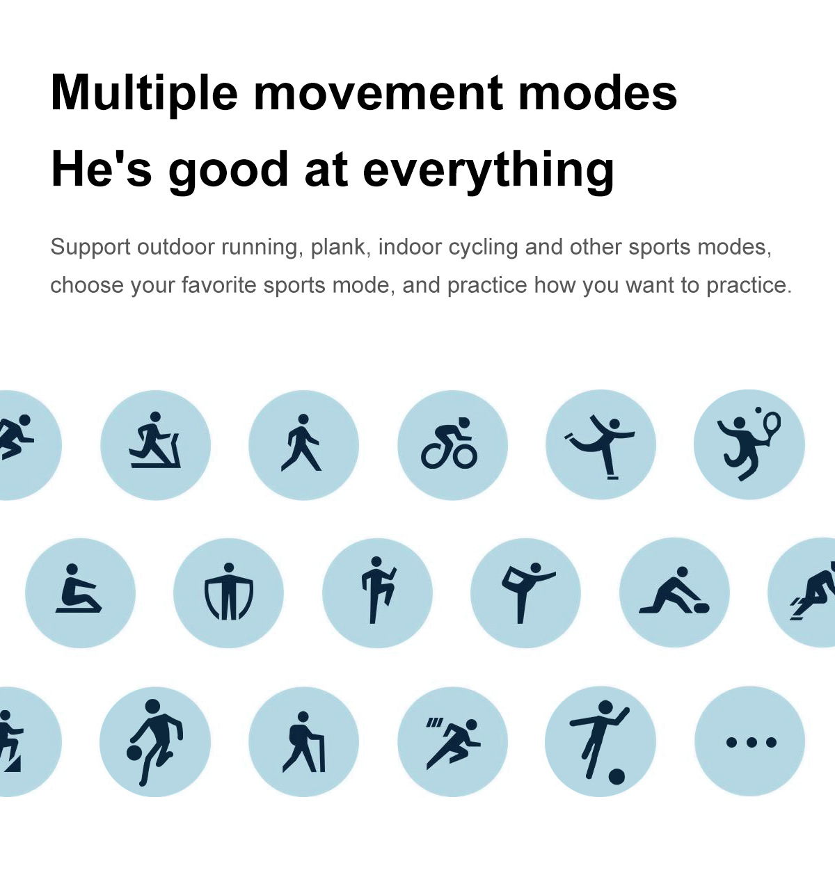 运动数据(计步、距离、卡路里)、室内运动(俯卧撑、室内跑步、平板撑、室内单车、跳绳、瑜伽、战绳、仰卧起坐、椭圆机)、户外运动(户外步行、户外跑步、户外骑行、登山、羽毛球、篮球、足球)
