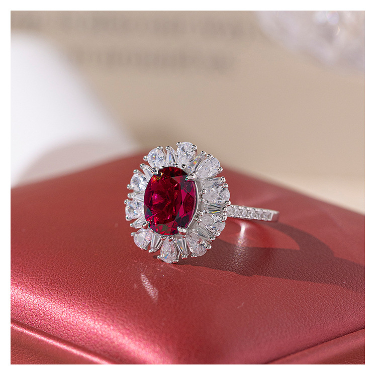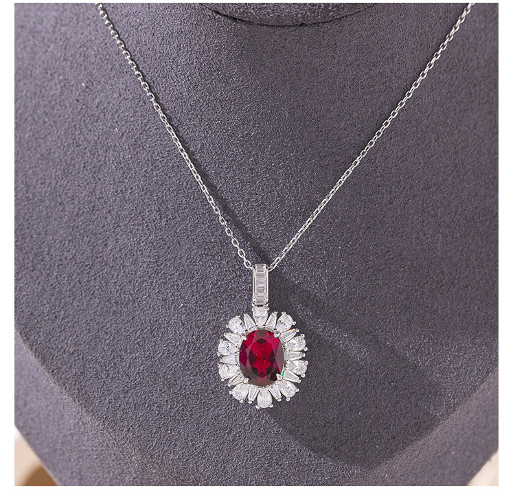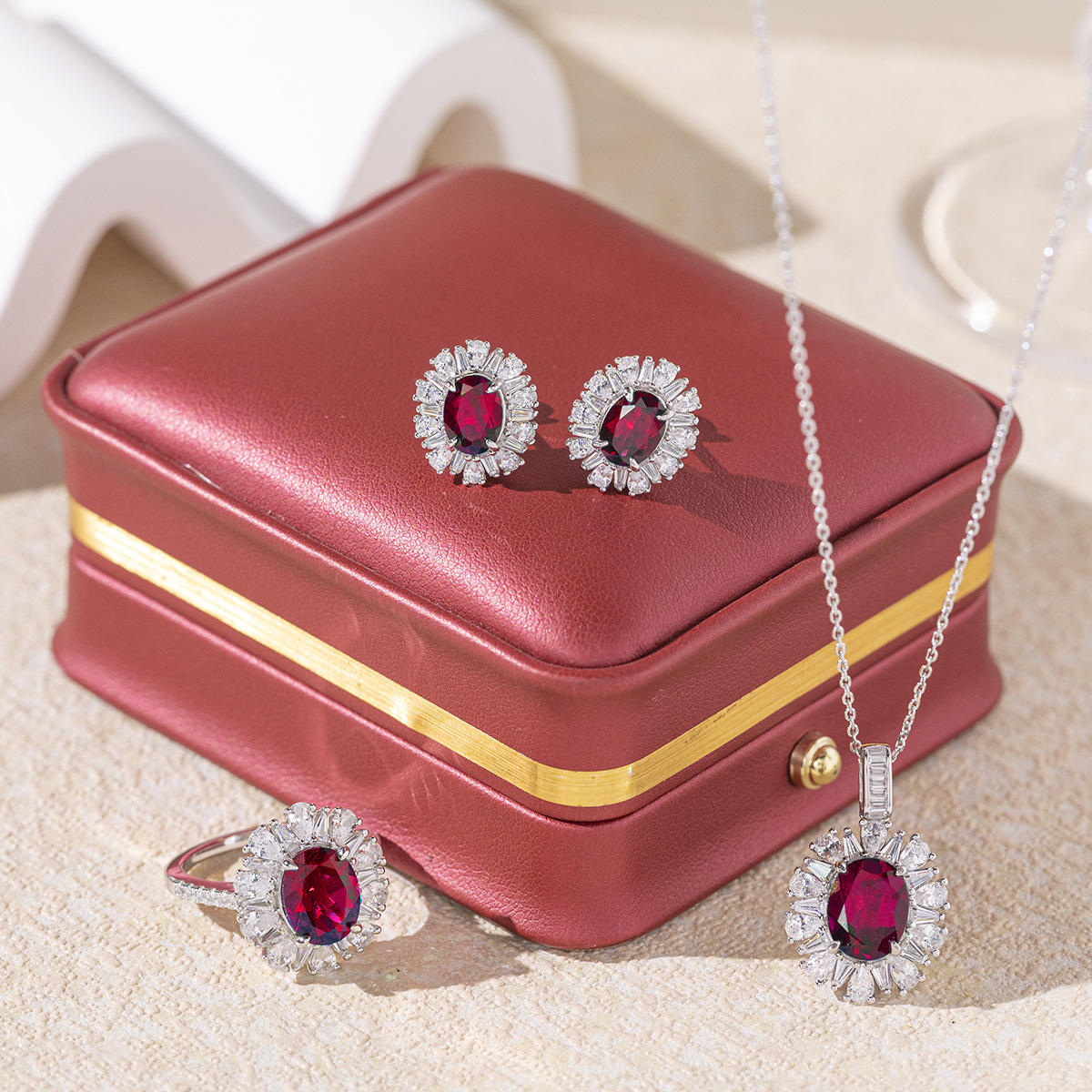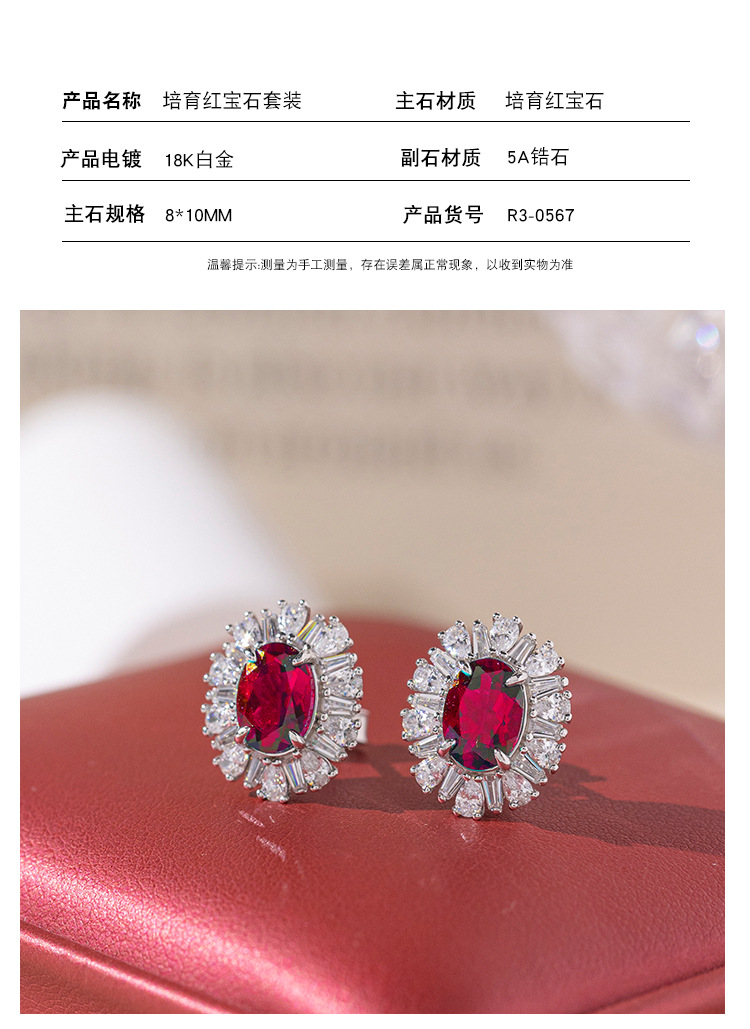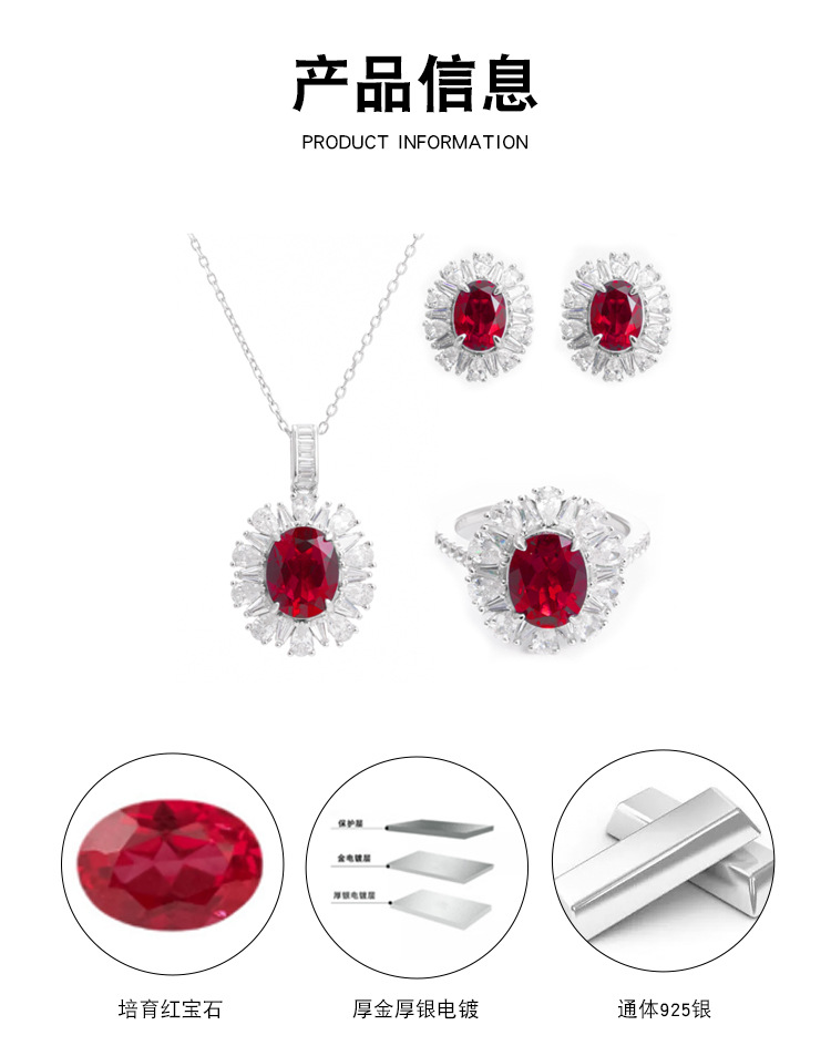 小红书热卖S925银镀18k金培育红宝石首饰套装戒指项链耳钉三件套