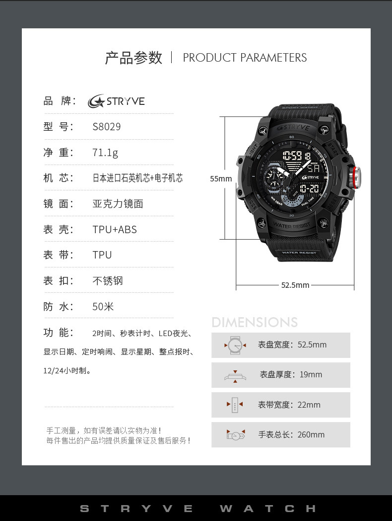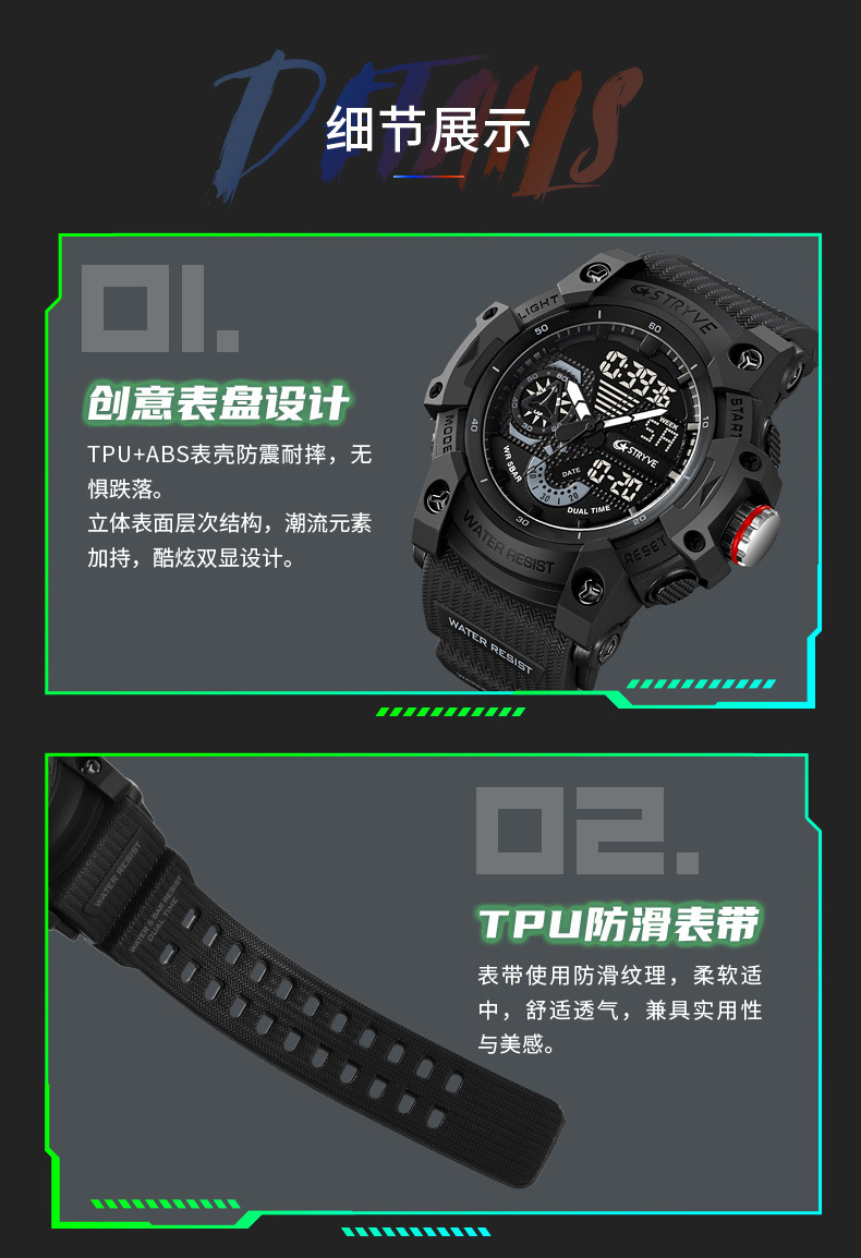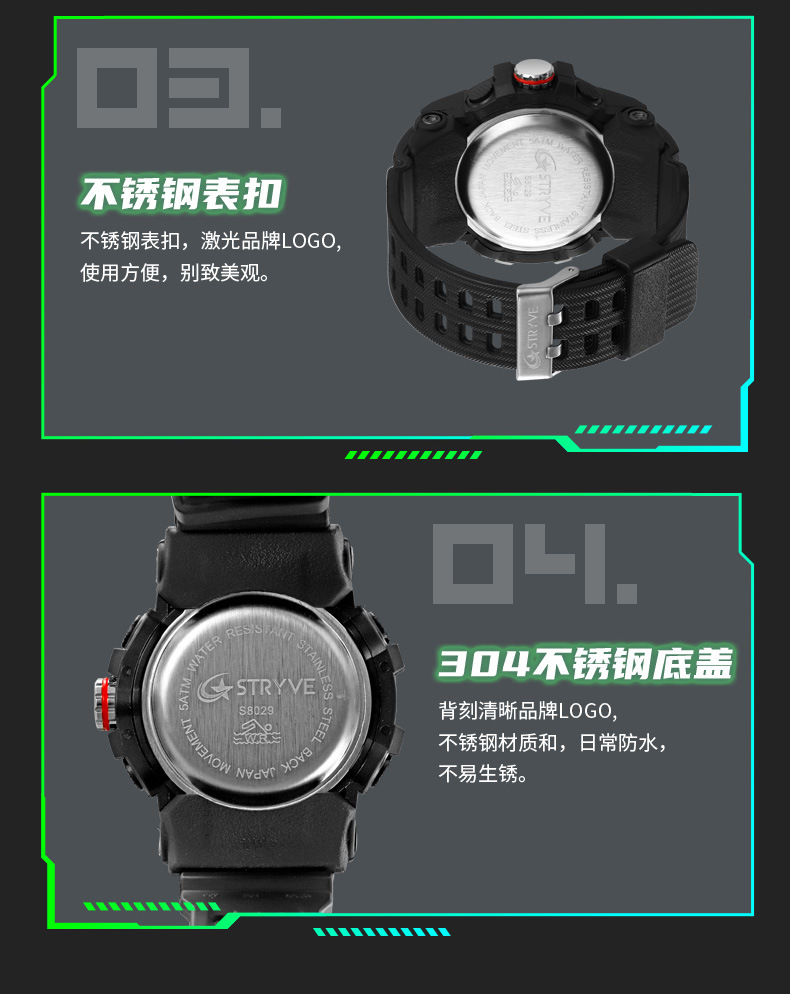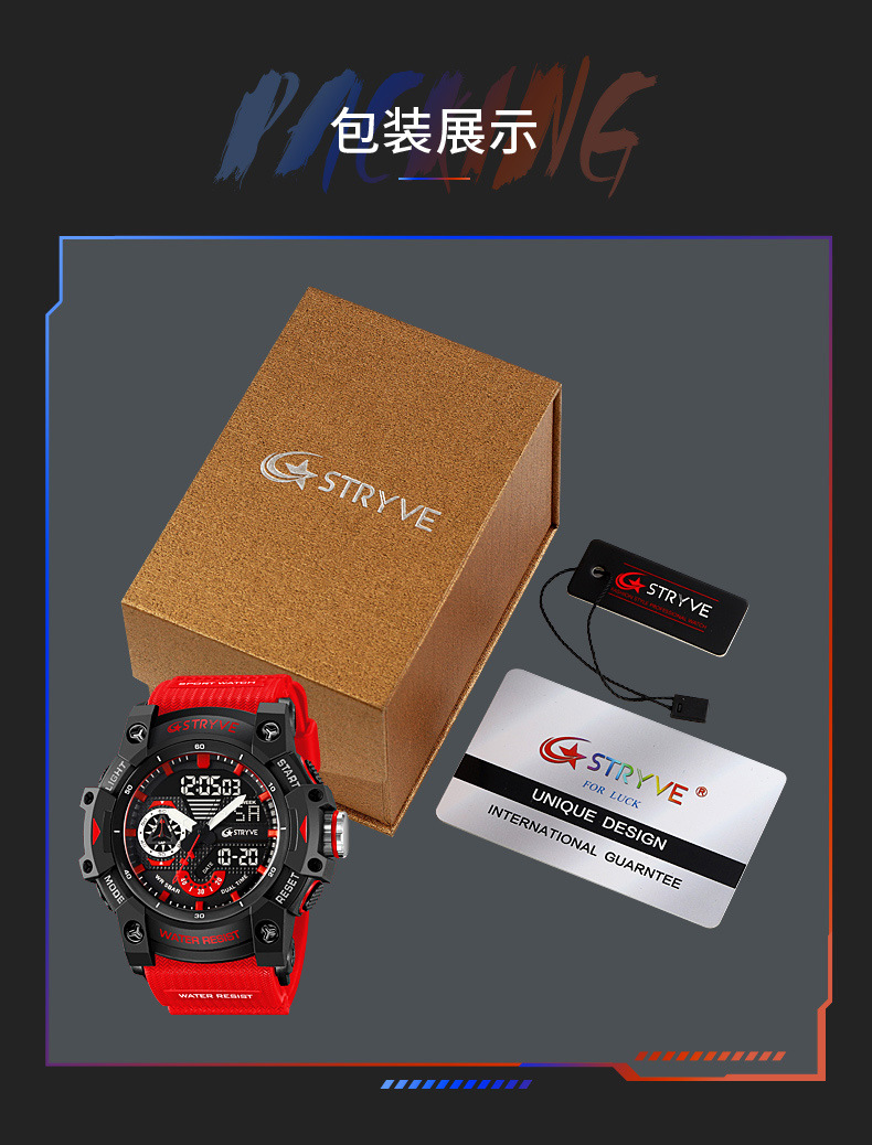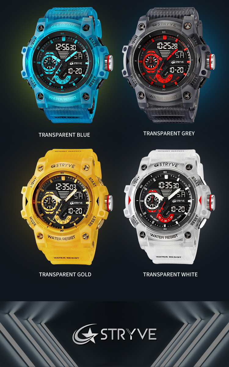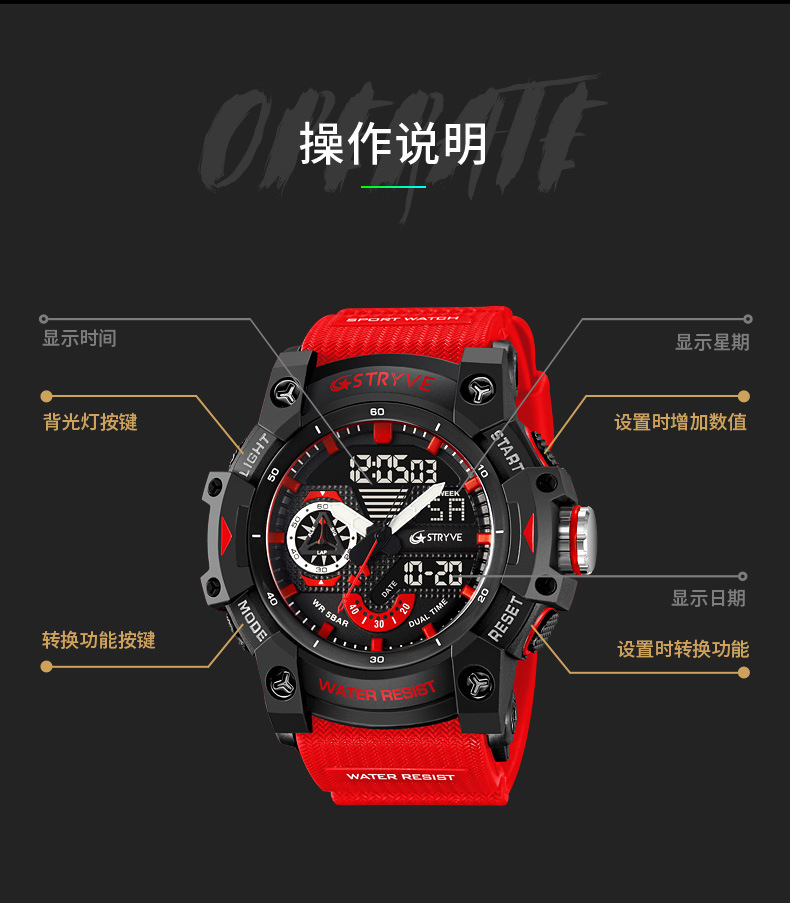 STRYVE男士时尚元素防水运动手表双显夜光电子多功能学生表S8029