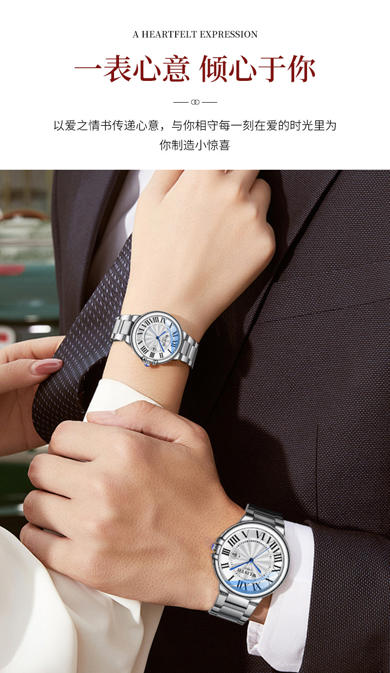 沃力仕情侣表日历钢带防水夜光经典男士手表跨境外贸石英表男表